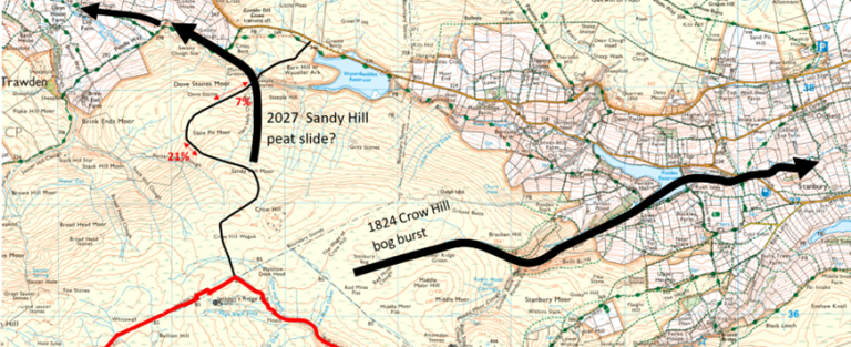 The most important Brontë site for the engineers of CEP to consider is the Crow Hill bog burst of 2 September 1824, a vast peat slide which exploded while Anne (4) and Emily (6) were in its path, sheltering from the storm in a farm porch. The boom of the exploding bog was heard in Leeds, but also in Haworth, where Patrick Brontë had to wait anxiously for the return of his children. Peat, water and huge boulders poured past the children in a torrent seven feet deep. The bog burst is very well descibed by Anne Dinsdale, Senior Curator at the Haworth Parsonage in this short video. The north apex of CEP is Option B for the site entrance. If it is chosen, then the construction workers must build a zig zag track up to Crow Hill and then cross a huge area of deep and unstable peat, by far the most complex ground on the site. This crushed rock track must then carry the 45000 lorry-loads of rock that will be used to build CEP, for the local rock, though strong in a block, is too weak, porous and susceptible to frost to make a roadstone or concrete. Local builders use limestone from North Yorkshire to build tracks, but limestone will not be permitted on the acid bog, so the developers may have to bring their aggregates from beyond Yorkshire.