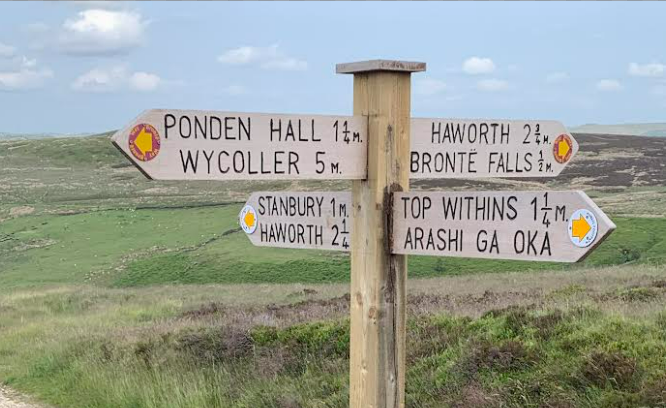 [3.311] Top Withins draws people from all over the world, and the signpost below the ruin is in romanised Japanese: Arashi ga oka = Wuthering Heights. The theme of sexual desire transcending social boundaries is said to resonate with the Japanese, and the novel forms part of their school curriculum.